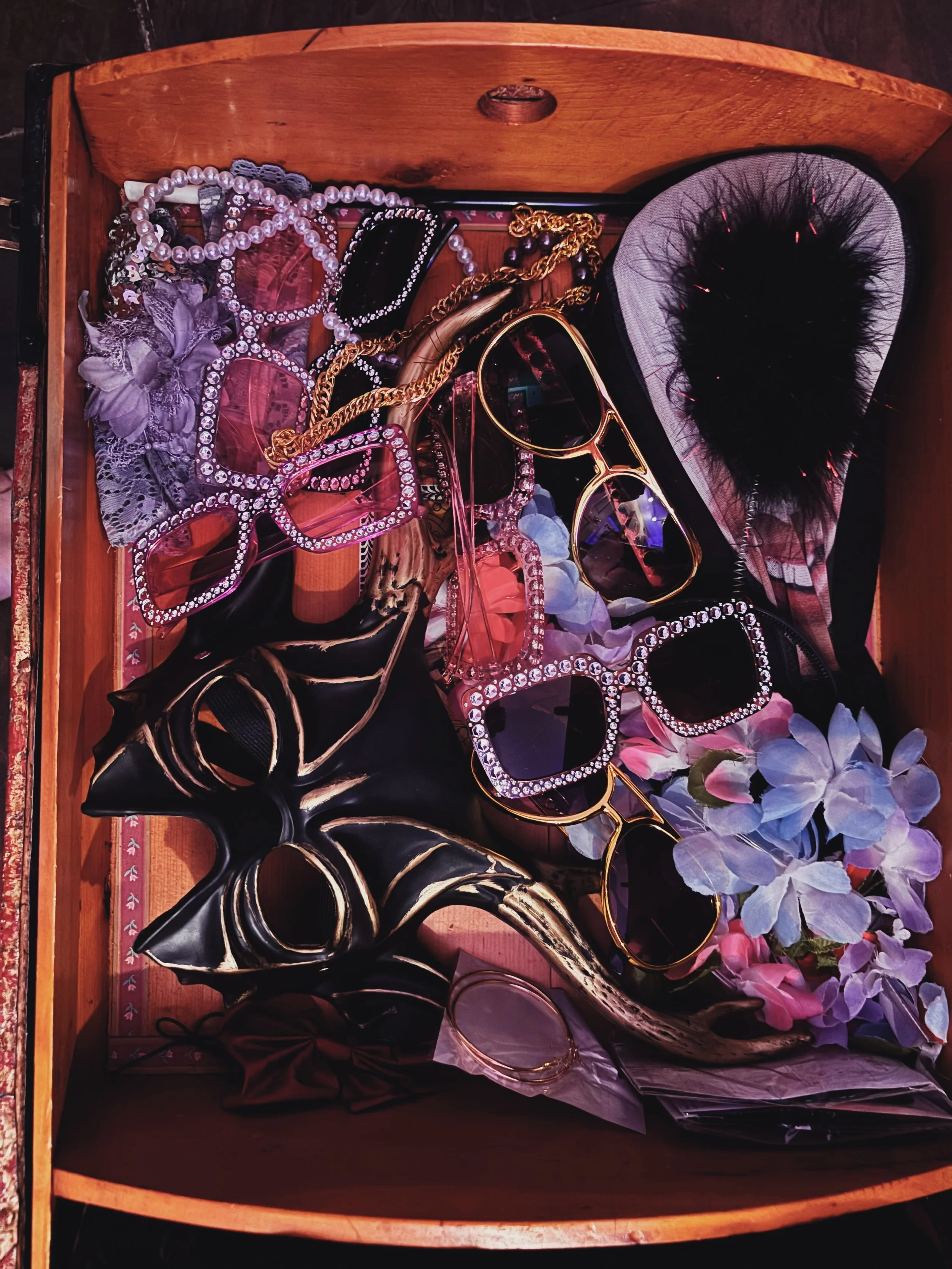 Our magical costume trunk is an antique steamer trunk from the 1800’s. It came to us with this amazing portrait inside from the original owner.. Gaze upon young Lord Phluffenutter of Sauftbottom Manor. He bids you “Adorn thyself and entertain us!”